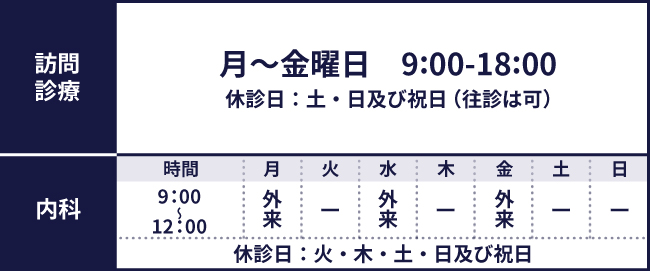 当クリニックの診療科目は「総合内科・皮膚科・精神科」となっております。通院が困難な方、夜間に症状が変わりにくい方、その他ご自宅で週末医療を希望される方はお問い合わせください。